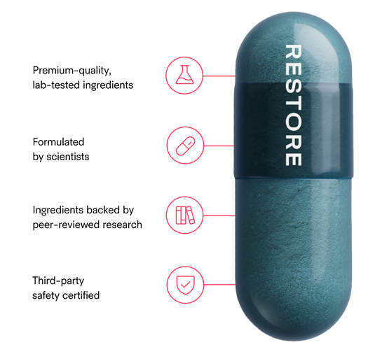 Support healthy aging while you sleep with Restore, our daily supplement designed to optimize your rest. It's formulated with a blend of magnesium, L-theanine, and apigenin to help you fall asleep faster, stay asleep, and get higher quality sleep so you can wake up rejuvenated.